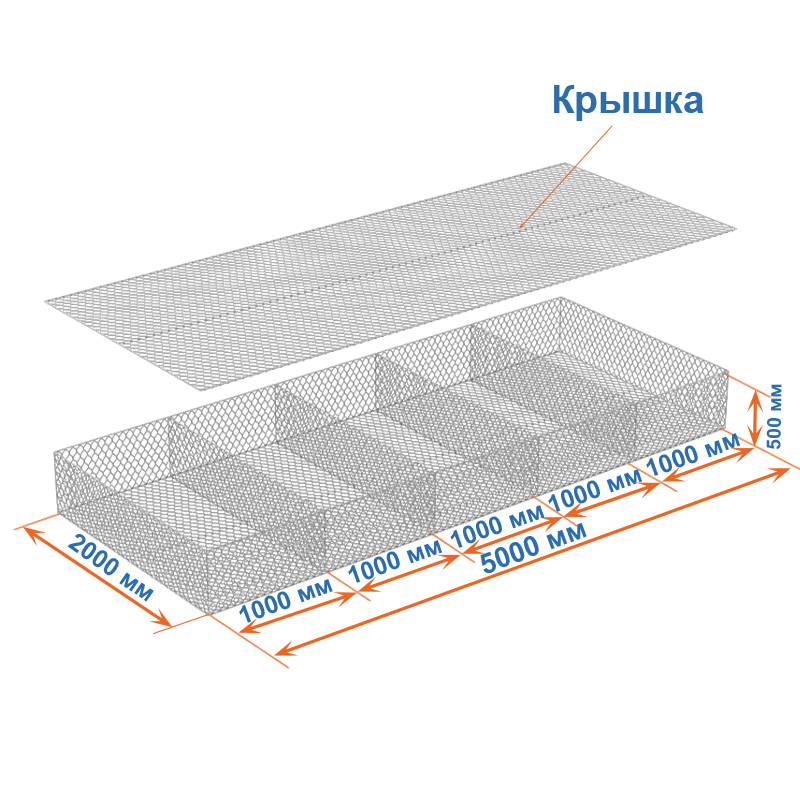 Матрасы Рено 5х2х0,5 — плоские габионные секции из сетки двойного кручения с ячейкой 60х80, проволокой 2,2 мм и покрытием Цинк.
